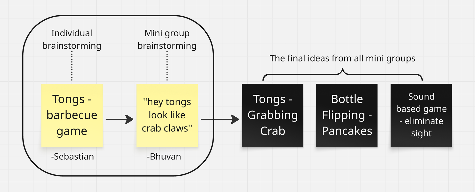 The Bottle Flipping and the Sound/Sight games had similar idea evolutions with team members riffing on each other's ideas