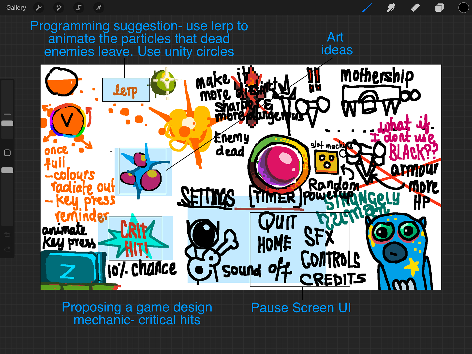 On solo projects, I visually note down everything that feels right to add. These notes usually include the art for the game's visual style, game design problems to solve, UI styles, programming related stuff etc.